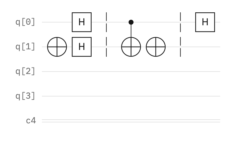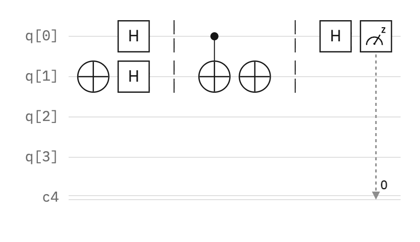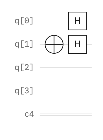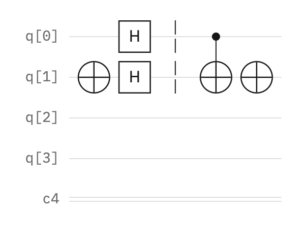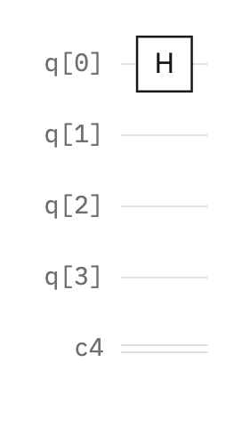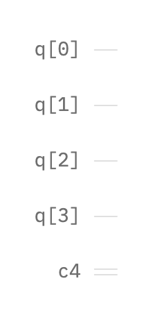 Here is an initialized quantum circuit with a register of four qubits (q[0], q[1], q[2], q[3], q[4]) and a classical register (c4).