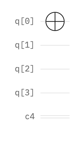 Qubits can be in state |0⟩ or |1⟩. Initially, qubits are in the ground state |0⟩. To initiate a qubit, it must move from this ground state to the state |1⟩. One approach is to apply a NOT gate, which inverts (switches the state to the opposite) state. This quantum circuit (q[0]) has a single NOT gate (represented by a circular target) that operates on a single qubit.