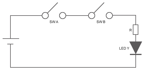 More practically, the example below demonstrates how a digital circuit with an AND gate controls the lighting of LED Y based on the binary example above. LED Y turns off (or 0) when output Y is SW A and/or SW B are off (or 0). LED Y lights up (or 1) when both SW A and SW B are on (or 1).