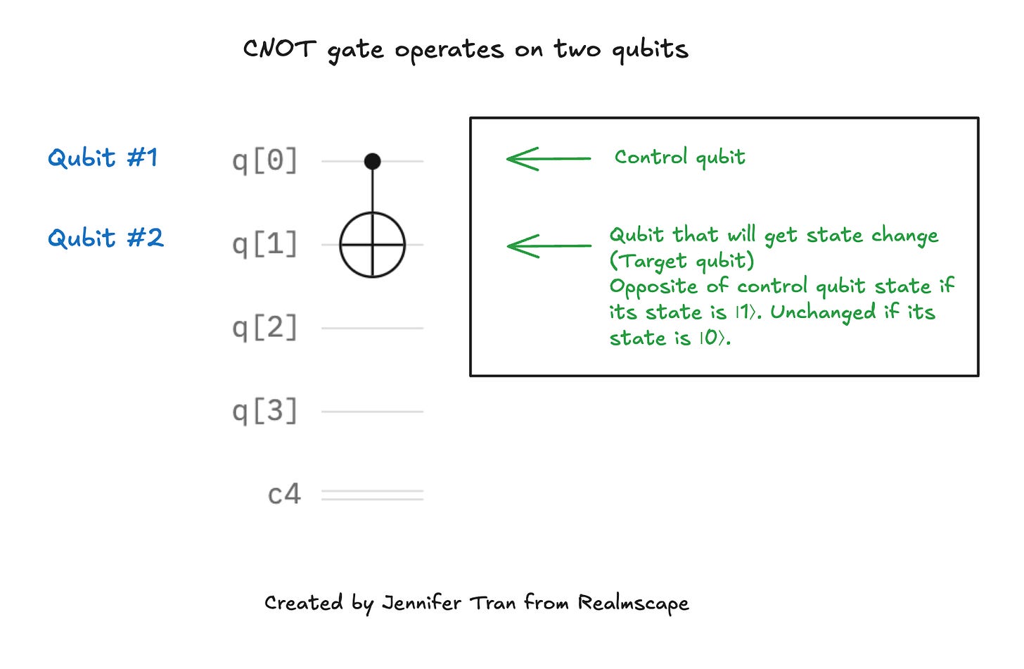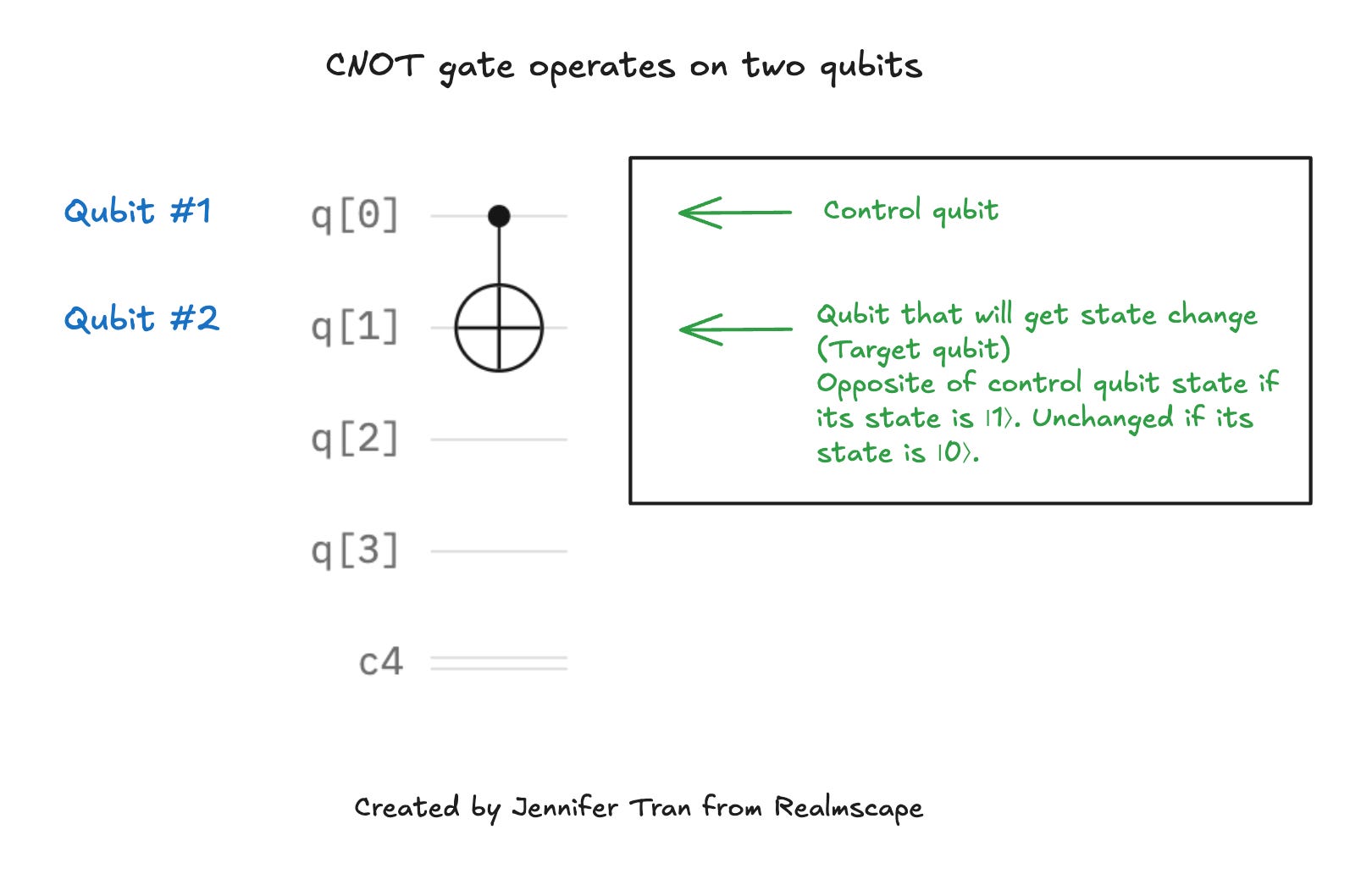 To connect or entangle with another qubit, the circuit needs to apply a two-qubit component that operates on two qubits at a time. A controlled NOT or CNOT gate takes two qubits: the first, a control qubit, and then a target qubit, and it changes the state of the target (second) qubit to the opposite of the control qubit’s state only if the control qubit’s state is |1⟩.