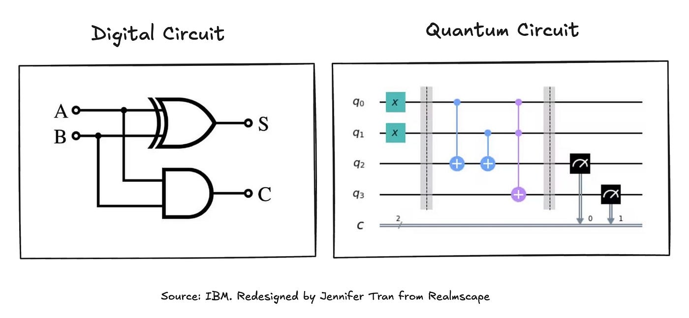 Here’s a diagram comparing a digital and a quantum circuit, showing both graphical similarities and distinct components.